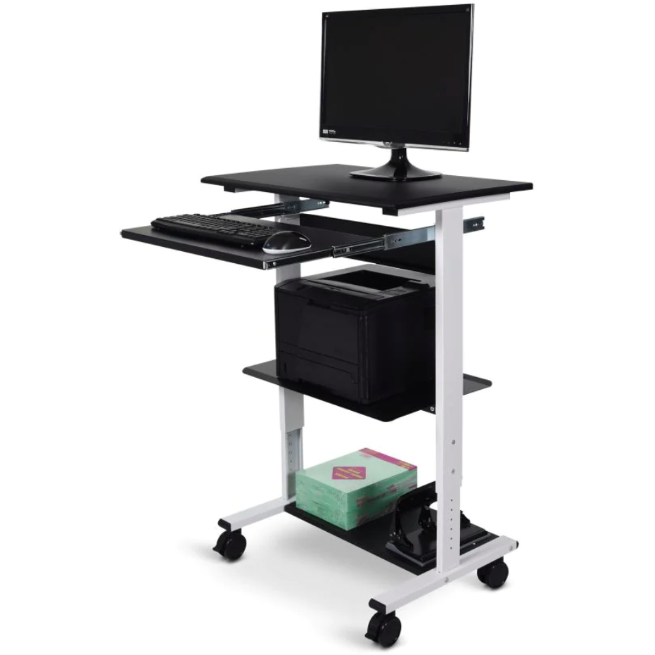 If you're looking for a mobile workstation or office desk, we've got the perfect option. This office desk features three shelves and a retractable keyboard shelf so you can easily set up your equipment however you need. It is made of sturdy powder-coated steel with locking casters, and a black veneer top. It can also be adjusted to different heights.