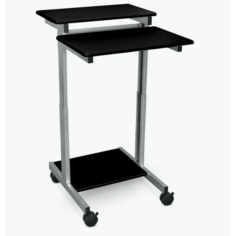 With a powder-coated steel base and stable wheels, this mobile sit-stand office desk is the perfect option for when you have to move around during the day or give presentations. It has two shelves, one for a screen and one for a keyboard or other office or presentation supplies. This desk is mobile and sturdy, a great option for any office.