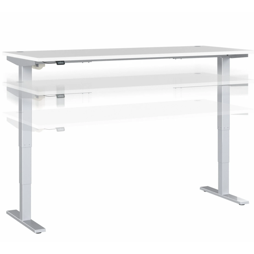This elegant, broad desk merges a brilliant white top with sleek matte silver legs for a classy finish. The entire top moves to the perfect height with the press of a button, thanks to a silent electric motor. The range of height, from 28" all the way to 48", ensures that this desk can suit a vast variety of office needs. A small footprint with two delicate legs and stabilizers on the bottom of the feet ensures that this desk fits in a variety of settings. The sprawling top is wide enough to hold a monitor, decor, and even the largest projects with no problem.